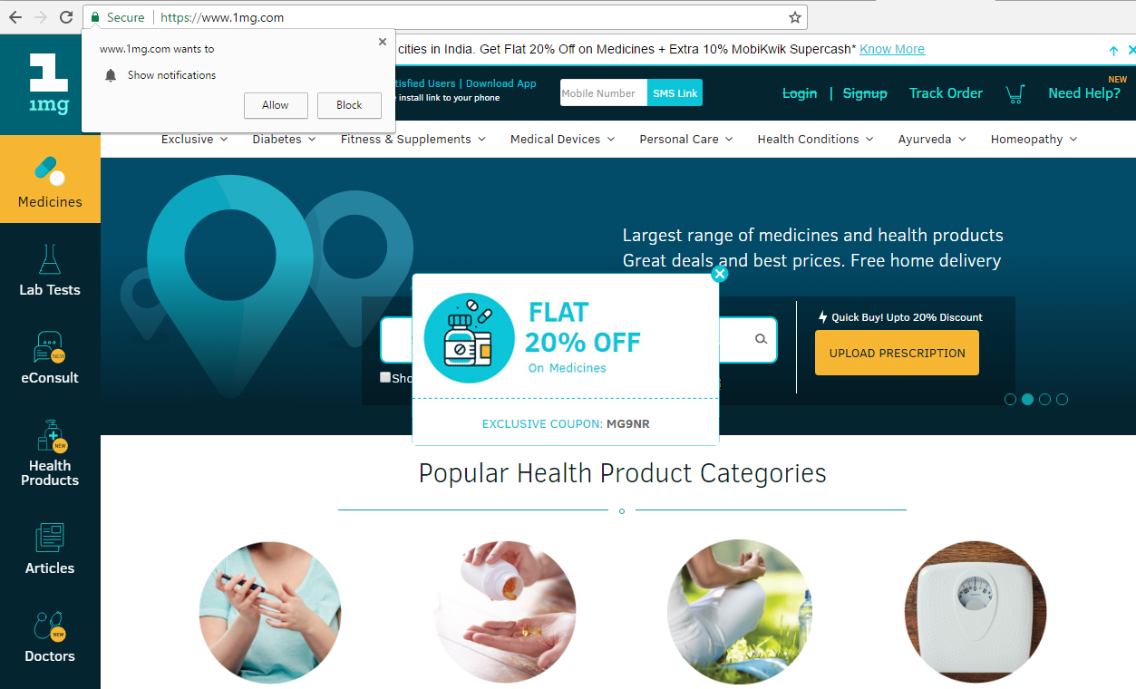 Result: Implementing web push with a call to action features enabled 1MG to drive more traffic to their blogs. Apart from providing a regular flow of viewers to their site it also enabled them to keep their users informed about the developments happening in the medical field.