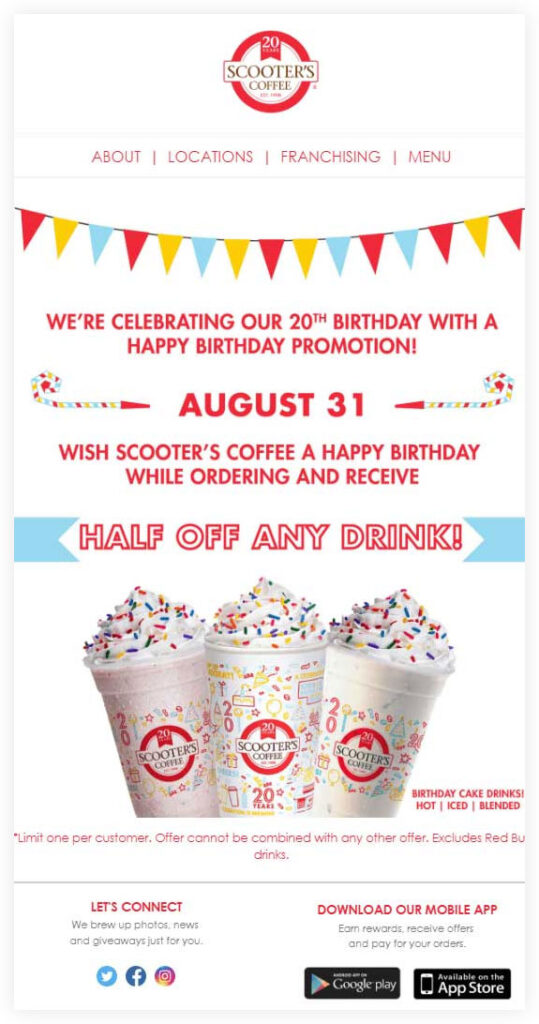 Typical Scooter’s emails usually explain new and seasonal flavors. But they do a fantastic job driving traffic by sending promotional emails and coupons. For this purpose, you can utilize platform like Bountii where you can offer a extensive range of additional deals and Coupons.