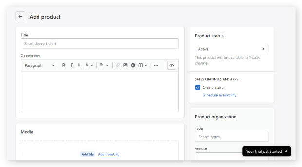 - Manually Add Product: If you have a few products, this will do the trick. You will have to fill out product details such as name, vendor, description, and product type, and upload the required images.