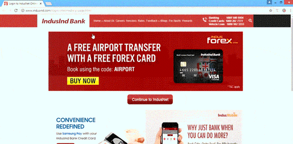 Credit card offer in the same place as a homepage for customers who searched or viewed credit card on the IndusInd website.