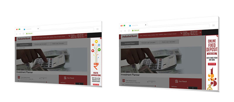 IndusInd uses NotifyVisitors sticky sidebar banner to show recommended and targeted offers to customers on the basis of their activity and behavior. To increase sales and to convert your visitors into your customers, you have to show them a right offer, in the right way at the right time. This is what IndusInd do with help of personalization They dynamically change banner with targeted offers on the basis of users last activity. As shown in images below both offers are for same visitors, when visitors visit their fixed deposit page, all sidebar banner on website changes to fixed deposit offers.