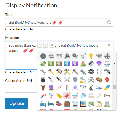 Let’s say you want to give a gift voucher to users who shop more than Rs. 500 with the following push notification: “Buy more than Rs. 500 and get BookMyShow movie voucher” and you want to include crackers and movie ticket Emoji.