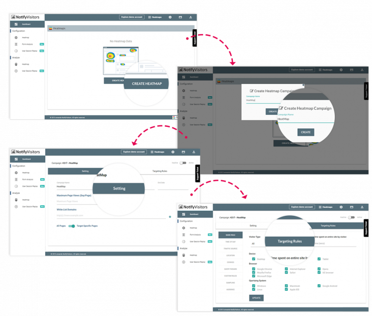 Confetti maps: These heatmaps show you about the clicks from different segments of viewers, from where these clicks are coming or from which referral source segment. This will help you to know, which referral source gives you the most relevant users. Confetti uses a different color dot for every referral segment. Like different countries will be represented by different colors.